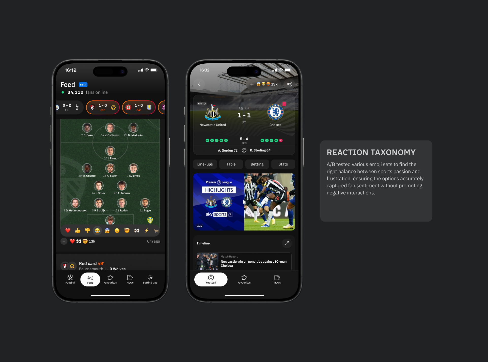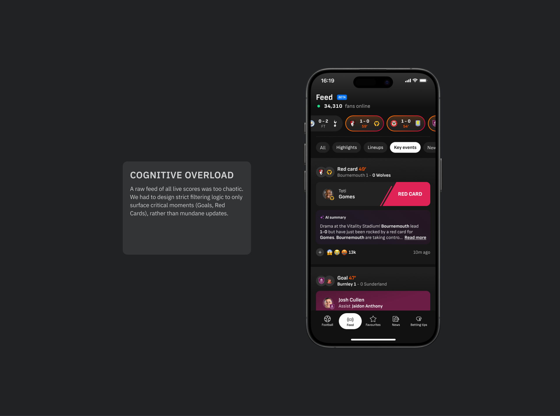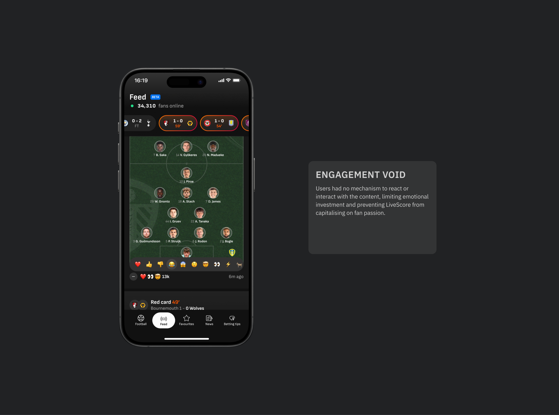 LiveScore users were siloed in single match views. To track multiple games, they had to constantly navigate back and forth, creating friction. Furthermore, the platform operated entirely as a one-way broadcast; the business needed a way to increase session depth and foster a sense of community without introducing the toxicity of open comment sections.