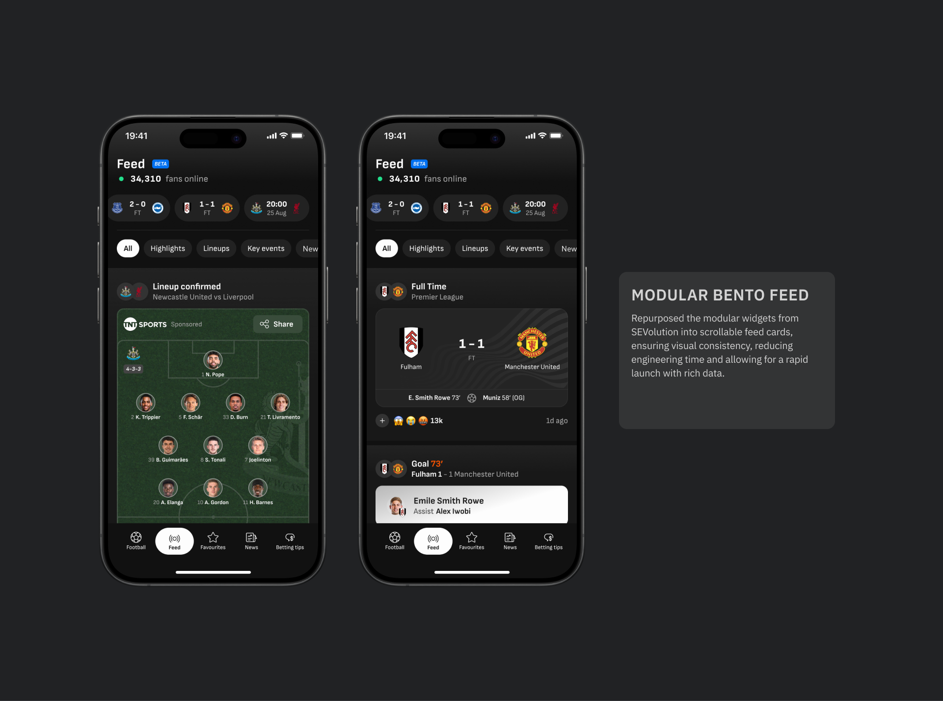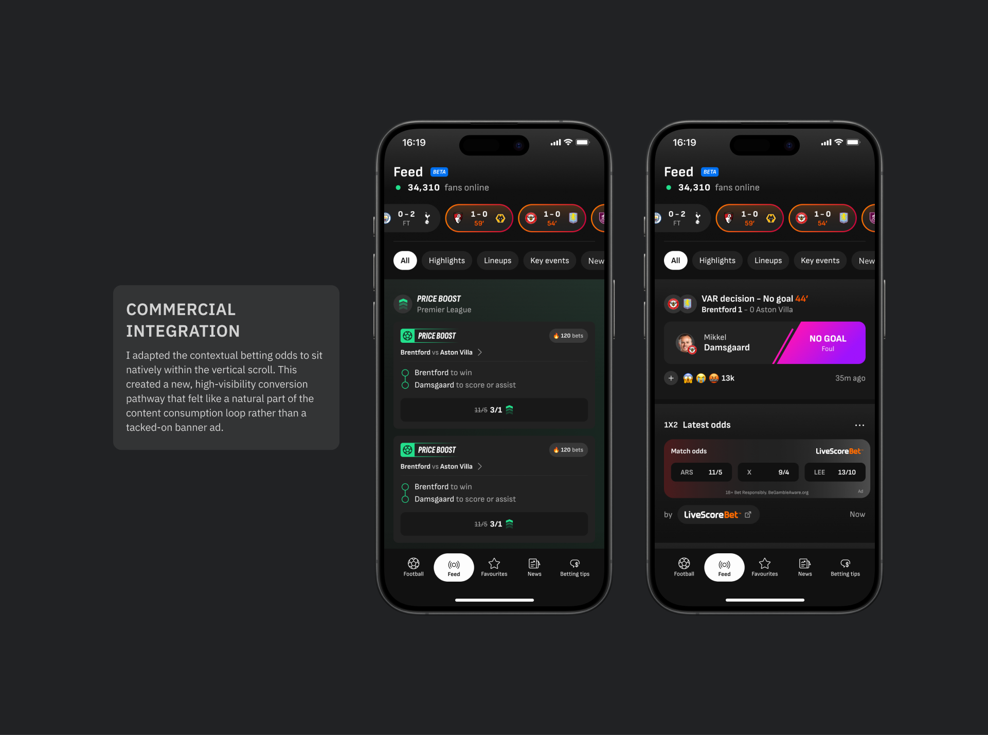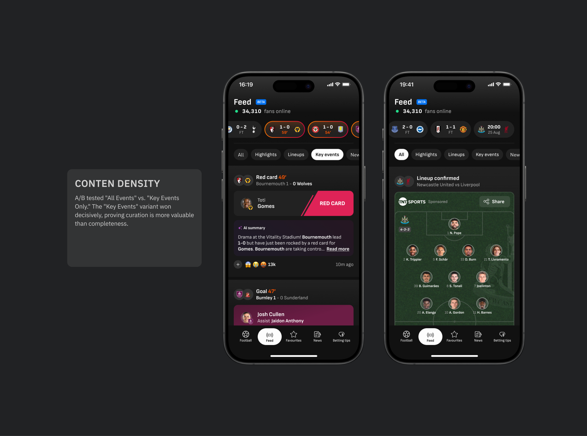 LiveScore users were siloed in single match views. To track multiple games, they had to constantly navigate back and forth, creating friction. Furthermore, the platform operated entirely as a one-way broadcast; the business needed a way to increase session depth and foster a sense of community without introducing the toxicity of open comment sections.